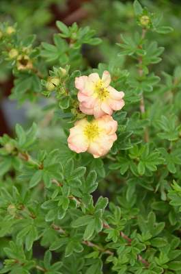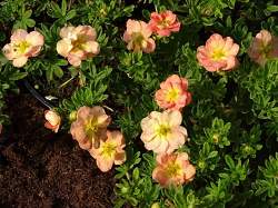 Лапчатка Bella Apple (Белла Эппл). Невысокий кустарник с плотной раскидистой кроной. Крона подушковидная, густая. Цветение начинается в августе и продолжается до морозов. Цветки очень крупные, диаметром 5 см, светлые абрикосово-розовые. Цветение обильное. Высота 50-60 см, ширина 100 см.
