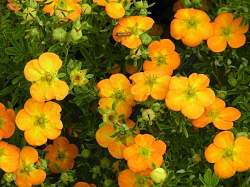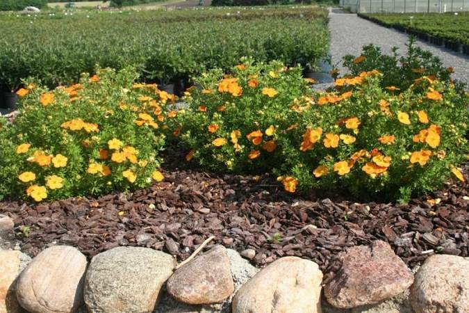 Лапчатка кустарниковая Bella Sol (Белла Соль). Компактная форма. Не требует обрезки. Цветки очень крупные, желто-оранжевые, по мере цветения не выгорают. Цветение обильное и длительное с июня по сентябрь. Высота 30 см. Морозостойкость -34 °С.