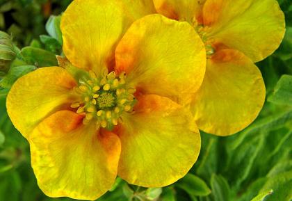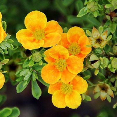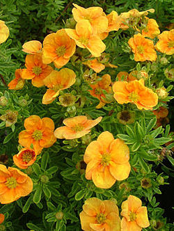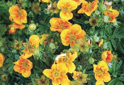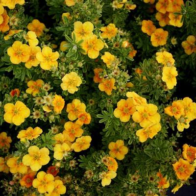 Лапчатка кустарниковая Mango Tango (Манго Танго). Высота 0,6 м. Куст компактный, аккуратный. Цветки крупные, двуцветные жёлто-оранжевые. Листья светло-зеленые, сложные, характерные для вида. Зимостойка, морозостойка. Светолюбива. Засухоустойчива.