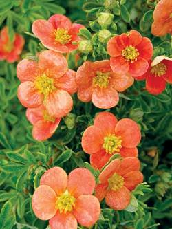Лапчатка кустарниковая Orangeade (Оранжад). Распростёртый плотный кустарник высотой 75 см, шириной 90 см. Побеги расположены почти горизонтально. Растёт медленно. Цветки красно-оранжевые с оранжевыми оттенками и жёлтым центром, красиво контрастируют с листвой.