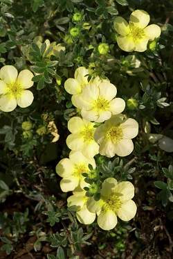 Лапчатка кустарниковая Primrose Beauty (Примроуз Бьюти). Невысокий кустарник, обильно цветущий светло-желтыми, почти белыми цветками. Цветение длительное. Прекрасно смотрится в разнообразных композициях. Возможно использование в бордюрах.