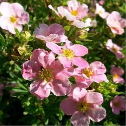 Лапчатка Princess (Принцесс). Кустарник до 0,4 м в высоту и около 1,2 м в диаметре. Цветки светло-розовые, в жаркое время светлее (белесоватые). Цветёт с мая до сентября. Предпочитает места от солнечных до полутенистых.