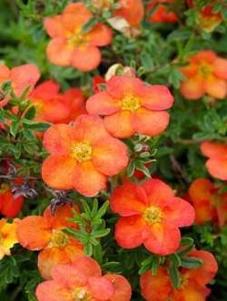 Лапчатка кустарниковая Red Ace (Рэд Эйс). Небольшой кустарник (около 50-60 см высотой и до 1 м в диаметре). На фоне ажурной светло-зеленой листвы выделяются красно-оранжевые цветки. Цветение продолжается с июня-июля до октября. Сорт предпочитает увлажненные полутенистые места, отзывчив к повышенной влажности воздуха. Великолепно смотрится в бордюрах.