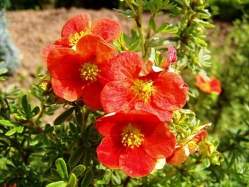 Лапчатка кустарниковая Red Joker (Ред Джокер). Красивоцветущий декоративный кустарник с компактной округлой кроной. Высота 0,6-0,8 м. Листья опушенные, сложные, светло-зеленые. Цветение с мая по октябрь. Цветки многочисленные красно-оранжевые.