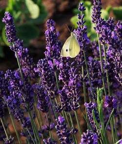 Лаванда узколистная Hidcote Blue (Хидкот Блу). Цветки сине-фиолетовые, ароматные, собраны в колосовидные соцветия. Цветет в июле-августе на протяжении 25-30 дней. Предпочтительнее освещенные солнцем места, защищенные от ветра. Лаванда не может расти на тяжелых глинистых почвах с повышенной кислотностью и высоким стоянием грунтовых вод.