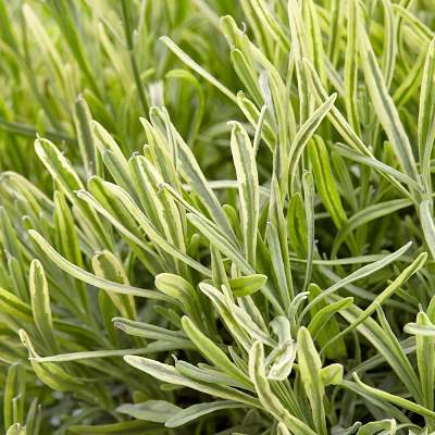 Лаванда узколистная Platinum Blonde (Платинум Блонд). Необычная новинка с пестрыми листьями. Листья узкие, зеленые с бело-кремовой каймой. Цветки лавандово-голубые, собраны в колосовидные соцветия. Высота кустарничка 70 см.