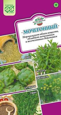 Лекарственный огород Мочегонный. Лекарственные травы, вошедшие в состав смеси, выводят лишнюю жидкость из организма. Настои и отвары фенхеля используют для улучшения пищеварения, устранения спазмов, усиления секреции желудка и кишечника. Артишок защищает печень от воздействия токсинов, снижает содержание холестерина и мочевой кислоты в крови, обладает мочегонным и желчегонным действием. Отвар иссопа употребляют для устранения воспаления мочевыводящих путей. Семена тмина нормализуют обмен веществ, ускоряют процесс пищеварения. Применяется при сниженном иммунитете, цистите, уретрите. Анис полезен при гастрите, коликах, заболевания почек. Натуральные, экологически чистые, выращенные и собранные с соблюдением норм травы помогут сохранить здоровье и продлить молодость.