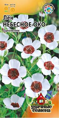 Лен Небесное око крупноцв. Неприхотливое растение из семейства Льновые высотой до 50 см. Стебли прямостоячие, изящные, сильноветвистые. Цветет в июле — августе. Цветки диаметром до 2 см, белые с красным центром собраны в рыхлые соцветия. Холодостоек, неприхотлив, но предпочитает солнечные участки с легкими почвами без застоя воды. Размножают посевом в открытый грунт весной или под зиму. Используют для оформления садового участка, наибольший эффект достигается при посадке группами.