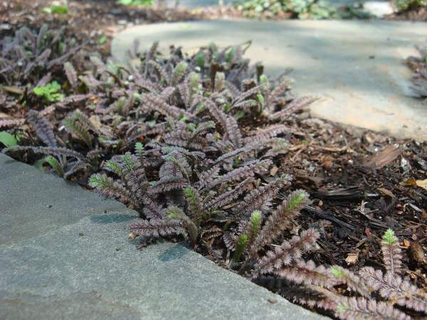 Лептинелла лапчатковая. Покровное растение, в высоту достигает всего 5-7 см. Листья с бронзовым налетом. Неприхотлива, довольно быстро заполняет пространство. Подходит для декорирования дорожек, заполнения щелей в отмостках.