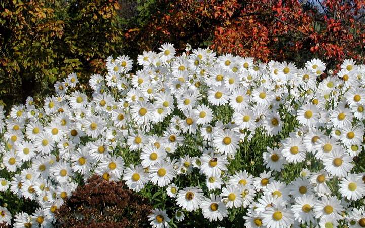 Леукантемелла осенняя (Хризантема поздняя). Высокое (до 1,5-2 м) мощное растение с сочно-зелёными листьями, почти одревесневающими стеблями. Зацветает крупными белыми ромашками очень поздно — во второй половине августа и остаётся огромным цветущим кустом до морозов. Крупные растения требуют плодородной влагоёмкой почвы, чтобы предстать во всей красе и мощи. Цветы 8-10 см в диаметре.