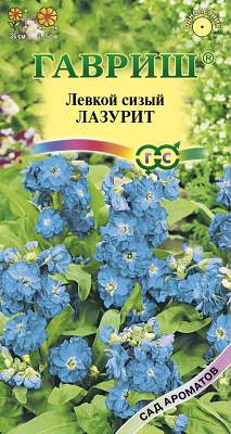 Левкой Лазурит. Однолетнее растение из семейства Крестоцветные с травянистыми или почти одревесневшими стеблями высотой 40 см. Цветет в июне-сентябре. Цветки диаметром 3-5 см, ароматные, собраны в кистевидные соцветия. Окраска цветков — голубая. Предпочитает хорошо освещенные участки с рыхлой, дренированной, удобренной почвой. Выращивают рассадным способом и прямым посевом в открытый грунт. Посев семян на рассаду проводят в марте. Рассаду высаживают во второй декаде мая на расстоянии 20-30 см. В открытый грунт семена высевают в конце апреля-начале мая с последующим прореживанием.