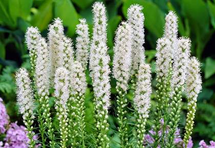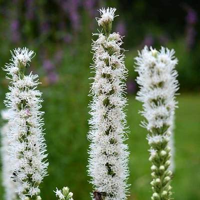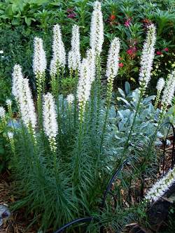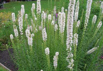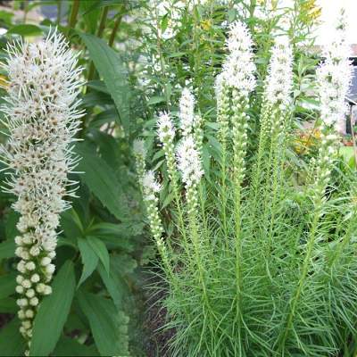 Лиатрис колосковая Alba (Альба). Неприхотливое и эффектное растение, цветущее во второй половине лета. Цветение продолжительное. Белые соцветия-свечи держатся почти месяц. Хорошо стоит в вазе, красиво дополняет пестрые букеты.