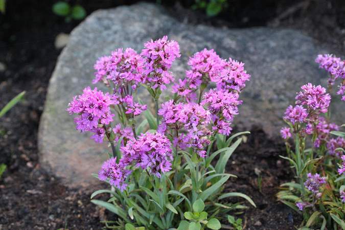 Лихнис альпийский. Компактное растение с линейными листьями в прикорневой розетке и множеством ярких красновато-розовых цветков. Высота 15-20 см, абсолютно беспроблемное, обильно и ярко цветущее растение.