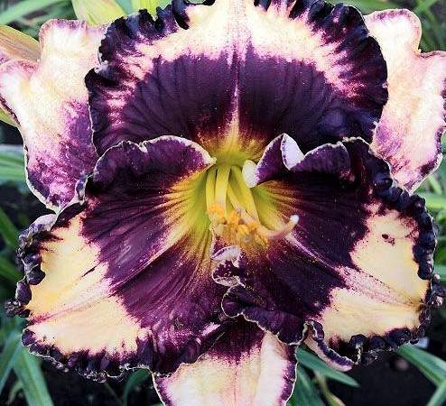 Лилейник George Seurat (Жорж Сера). Тетраплоид, DOR. Лилейник с мощной, драматической окраской. Цветок крупный, 15 см в диаметре, почти белый с большим темно-пурпурным глазом, горло зеленое. Кайма гофрированная, чернильная. Высота 69 см. Срок цветения средне-ранний.