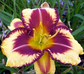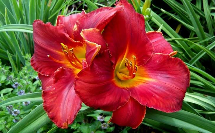 Лилейник Amadeus (Амадеус). Алый, с зелёно-жёлтым горлом и волнистым краем лепестков. Полувечнозеленый. Цветок очень крупный. Повторное цветение.