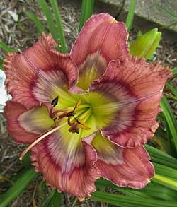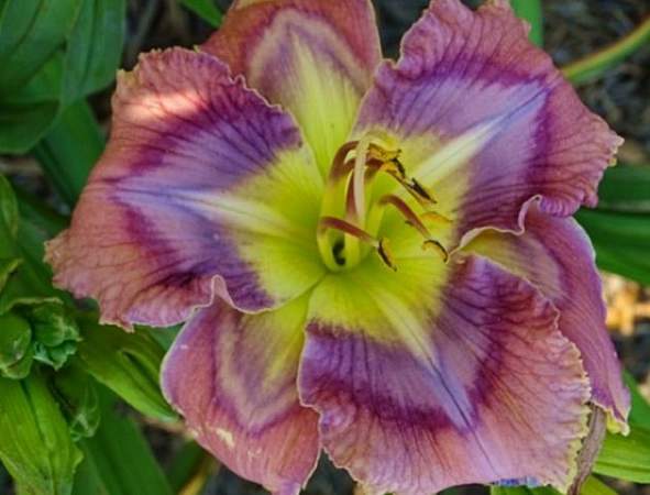 Лилейник Angel Love (Энджел Лав). EV. Тетраплоид. Крупный (15 см), лавандово-розовый бленд, глаз голубовато-фиолетовый с пурпурной обводкой. Кайма гофрированная. Высота 72 см. Срок цветения ранний. Необычный.