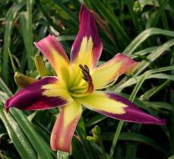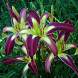 Лилейник Applique (Эплике). Спайдер, пурпурно-бордовый с зеленовато-жёлтой звездой в центре. Спайдер (паук) — лилейник с длинными узкими лепестками. Цветок огромный, от 28 см в диаметре.