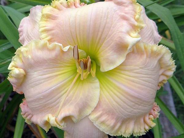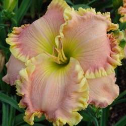 Лилейник April Laquinta (Эйприл Лаквинта). Тетраплоид. Цветок очень крупные (18 см в диаметре), розовый с золотой гофрировкой. Горло зеленое. Высота цветоноса 76 см. Срок цветения средний. Возможно повторное цветение. Ароматный.