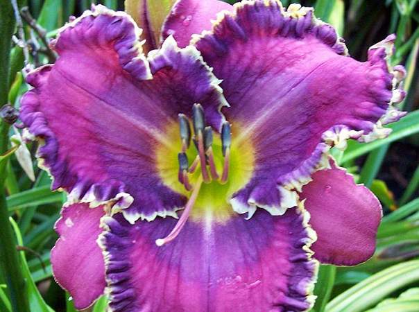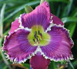 Лилейник Art Gallery Wisdom Tooth (Арт Гэллери Висдом Тус). SEV. Цветок пурпурный с пурпурным глазом, отливающим металлом. По краю лепестков гофрированная кайма с белой зубчатой окантовкой. Горло зеленое. Высота в цветении 70 см. Цветок диаметром 13 см. Срок цветения средний.