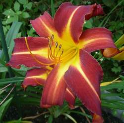 Лилейник Autumn Red (Отэм Ред). Надежный сорт, выносит даже засуху. Хорошо разрастается. Высота 65 см. Цветки 13 см в диаметре, в форме большой красной звезды с желтыми лучами из центре. Горло желтое.