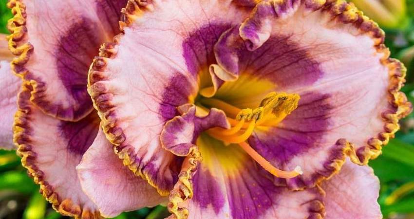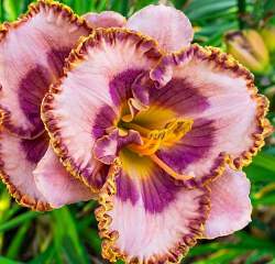 Лилейник Beachy Keen (Бичи Кин). Цветки идеального сложения, темно-кремово-розовые с двойной каймой — коричнево-фиолетовой и рыже-золотистой. Диаметр до 12 см. Глаз фиолетовый, горло желтое. Цветоносы крепкие. Цветет обильно и долго. Высота 55 см. Полностью зимостоек в средней полосе.