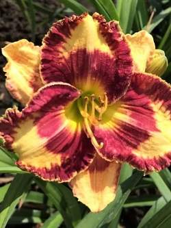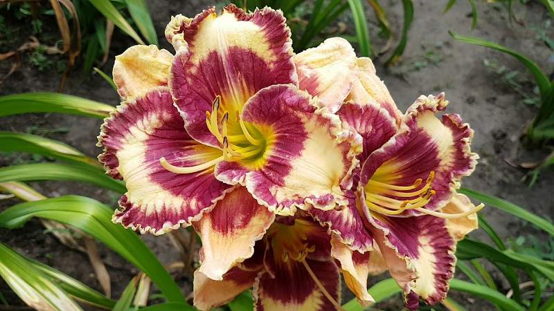 Лилейник Beauty Marked (Бьюти Макд) — цветки очень крупные (17 см в диаметре), кремовые с большим темно-сливовым глазом. Горло насыщенно-зеленое. Красивейшая гофрированная кайма. В период цветения достигает 71 см.