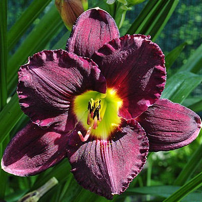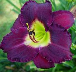 Лилейник Bela Lugosi (Бела Лугози). Бархатный тёмно-пурпурный цветок с широким зеленоватым горлом и легкой гофрировкой внутренних лепестков, ароматный. Полувечнозеленый, тетраплоид.