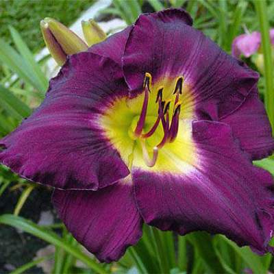 Лилейник Bela Lugosi (Бела Лугози). Бархатный тёмно-пурпурный цветок с широким зеленоватым горлом и легкой гофрировкой внутренних лепестков, ароматный. Полувечнозеленый, тетраплоид.