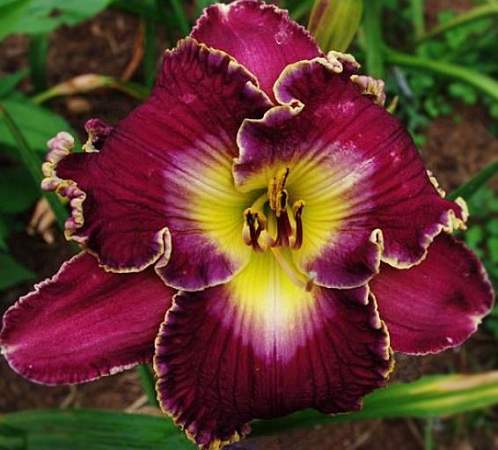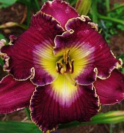 Лилейник Belize (Белиз). SEV. Тетраплоид. Пурпурно-сливовый со светлым водням знаком и золотыми краями. Горло зеленое. Гофрированные. Высота 69 см. Диаметр цветка 14 см. Срок цветения средне-поздний.