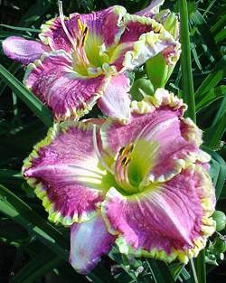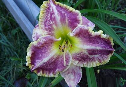 Лилейник Bestseller (Бестселлер). Сиреневый с белой полосой по центру лепестка, зеленым горлом и желтой гофрированной каймой.