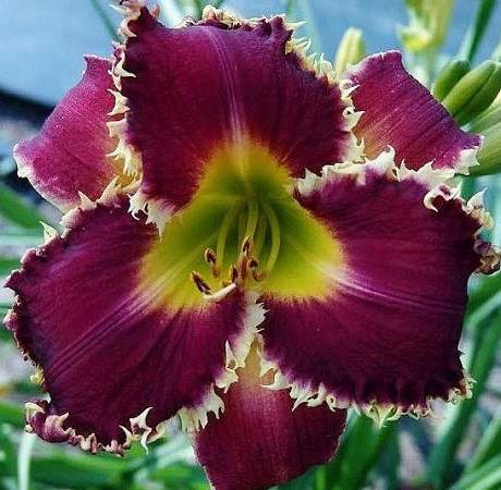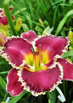 Лилейник Bettylen (Беттилен). Тетраплоид. Высота 65 см. Контрастный цветок пурпурного цвета, с белыми рюшами по краю лепестка, горло желто-зеленое. Цветок 14 см в диаметре. Сорт не слишком требователен к почве, хотя наибольшую декоративность показывает на плодородной влажной почве.
