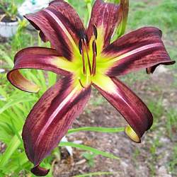 Лилейник Black Arrowhead (Блэк Эрроухед). Цвет бордовый с кофейным оттенком и жёлто-зелёным горлом. Спайдер. Цветки огромные, более 20 см в диаметре.
