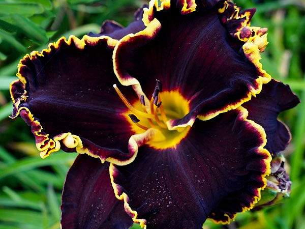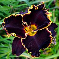 Лилейник Black Friday (Блэк Фрайди). TET, EV. Очень выразительный, впечатляющий! Почти черный, у глаза темно-вишневая зона, горло зеленое, по краю лепестков тончайшая золотая кайма. Красивая гофрировка. Высота цветоноса 69 см. Диаметр цветка 15 см. Срок цветения средний. Возможно повторное цветение. Ароматный.