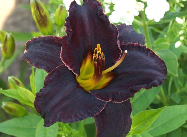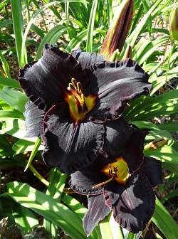 Лилейник Black Fury (Блэк Фьюри). DOR. Тетраплоид. Черный с лиловыми ребрами, с красной тонкой обводкой глаза, красиво гофрирован. Высот 76 см, диаметр цветка 12,5 см. Срок цветения средний.