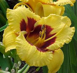 Лилейник Blackberry Candy (Блэкберри Кэнди). Золотисто-желтый цветок с вишневым глазом и желтым горлом, лепестки слегка гофрированные, отогнутые. Лилейник Blackberry Candy очень душистый и обильно цветет.