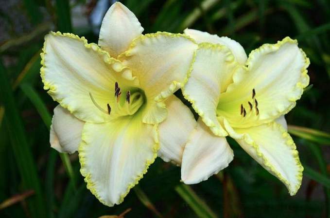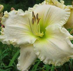 Лилейник Blizzard Bay (Близзард Бэй). Цветок нежный бело-кремовый с желтым гало и зеленым горлом, сильно гофрированные края с желтой каймой!