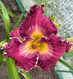 Лилейник Blue Abyss (Блу Абисс). SEV, TET. Шедевральный сорт. Цветок по диаметру более 21 см. Лавандово-голубоватый с широкой серебристой гофрированной каймой. Голубоватый водяной знак на темно-голубой подкладке. Горло зеленое. Высота цветоноса 84 см. Срок цветения средне-ранний. Ароматный. Бутонов — 30 шт.