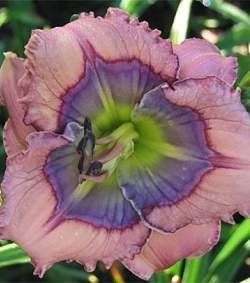 Лилейник Blue Crush (Блу Краш). TET, SEV. Сиреневато-розовый с голубовато-фиолетовым глазом и вишневым контуром. Горло зеленое. Высота цветоноса 66 см. Диаметр цветка 12,5 см. Срок цветения средне-поздний. Может цвести повторно.
