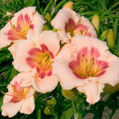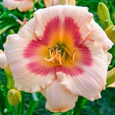Лилейник Blush 'n Pink Eye (Блашинг Пинк Ай). Приятная и необычная окраска цветка: лепестки кремово-розовые с красноватым глазком и желтым горлом. Кромка лепестков волнистая. Диаметр цветка 12 см.