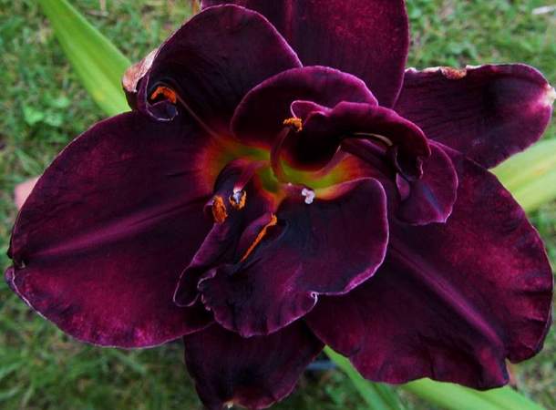 Лилейник Bogeyman (Бугимен). Цветок крупный, махровый, очень темного пурпурного цвета. Горло зеленое. Цветет в июне. Высота 60 см.