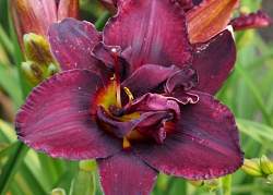 Лилейник Bogeyman (Бугимен). Цветок крупный, махровый, очень темного пурпурного цвета. Горло зеленое. Цветет в июне. Высота 60 см.