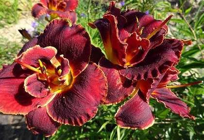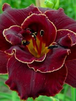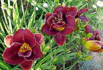 Лилейник Burgundy Love (Бургунди Лав). Тёмно-красный с зелёным горлом, крупный, махровый. Цветки диаметром 13-15 см, высотой 50-60 см. Растение не требует особого ухода. Но важно обеспечить ему постоянный доступ солнца.