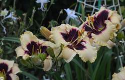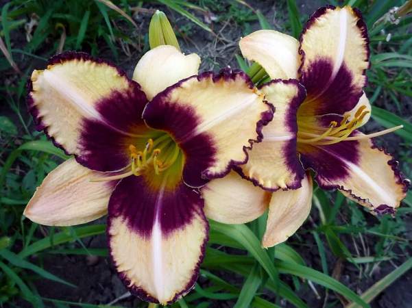 Лилейник Canadian Border Patrol (Канадиан Бордер Пэтрол). Цветок кремовый, контрастный, сливового цвета глаз и кайма на внутренних лепестках. Желто-зеленое горло, гофрированный. Высота 70 см. Цветки крупные, 15 см в диаметре.