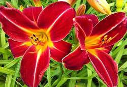 Лилейник Chewonki (Чевонки). Тетраплоид. Высота до 70 см. Цветки диаметром 14 см, ароматные, блестящие, алые с эффектной контрастной полосой и жёлтым горлом.