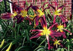Лилейник Chokecherry Mountain (Чокчерри Маунтин). Высота 75 см. Диаметр цветка 20 см. Спайдер. Винно-красный цветок с широким желтым центром, зеленым горлом и темно-фиолетовым глазом. Диплоид.