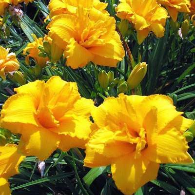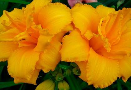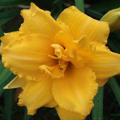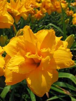 Лилейник Condilla (Кондилла). Спящий, диплоид. Цветок очень нарядный, желто-оранжевый, махровый, хорошо сложенный, диаметр цветка 12 см. По краю лепестков красивая гофрировка. Высота около 50 см. Срок цветения средне-ранний. Цветение обильное