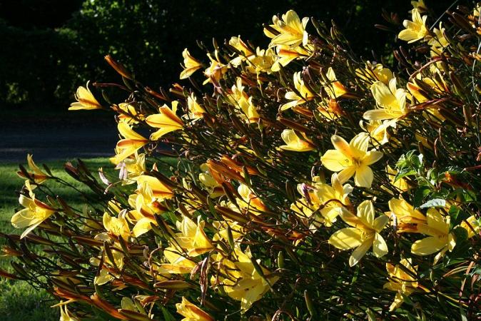Лилейник Corky (Корки). Цветки диаметром 7 см, яркие лимонно-жёлтые с красновато-коричневыми полосами на внешней стороне, цветоносы пурпурные, на каждом из них по 40 и более бутонов, листва узкая, сорт имеет награды