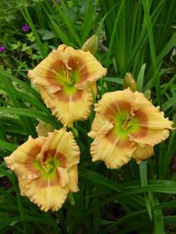 Лилейник Crocodile Eye (Крокодайл Ай). Цветок необычного оттенка — песочно-желтый с лавандовым глазком и зеленым горлом, ароматный.