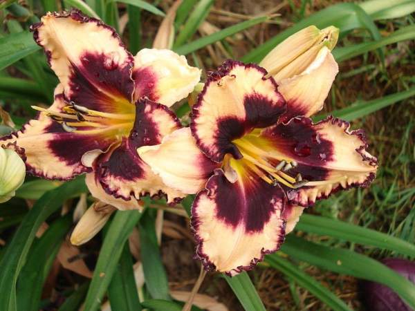 Лилейник Crystal Pinot (Лилейник Кристал Пино). Кремово-розовый с пурпурным глазом и узкой каймой на гофрированных лепестках, некрупное зеленоватое горло! Спящий, диплоид.