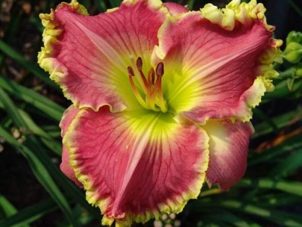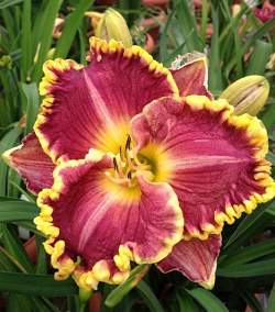 Лилейник Daria (Дарья). Малиново-пурпурные лепестки с тёмными прожилками и пышными рифлеными желтыми оборками по краю. Горло желтое. Цветоносы высотой 55-60 см. На каждом цветоносе до 20 бутонов. Цветки — 17 см! Повторное цветение. Тетраплоид.